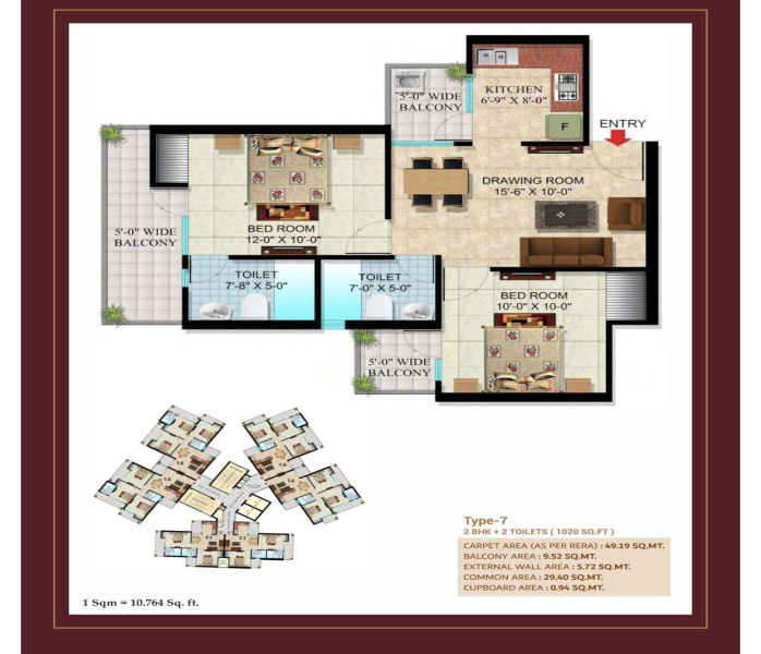 Units: Approximately 400+ units, featuring 1 BHK (approx. 485-520 sq.ft.), 2 BHK (approx. 990-1020 sq.ft.), and 3 BHK (1470-1560 sq.ft.).